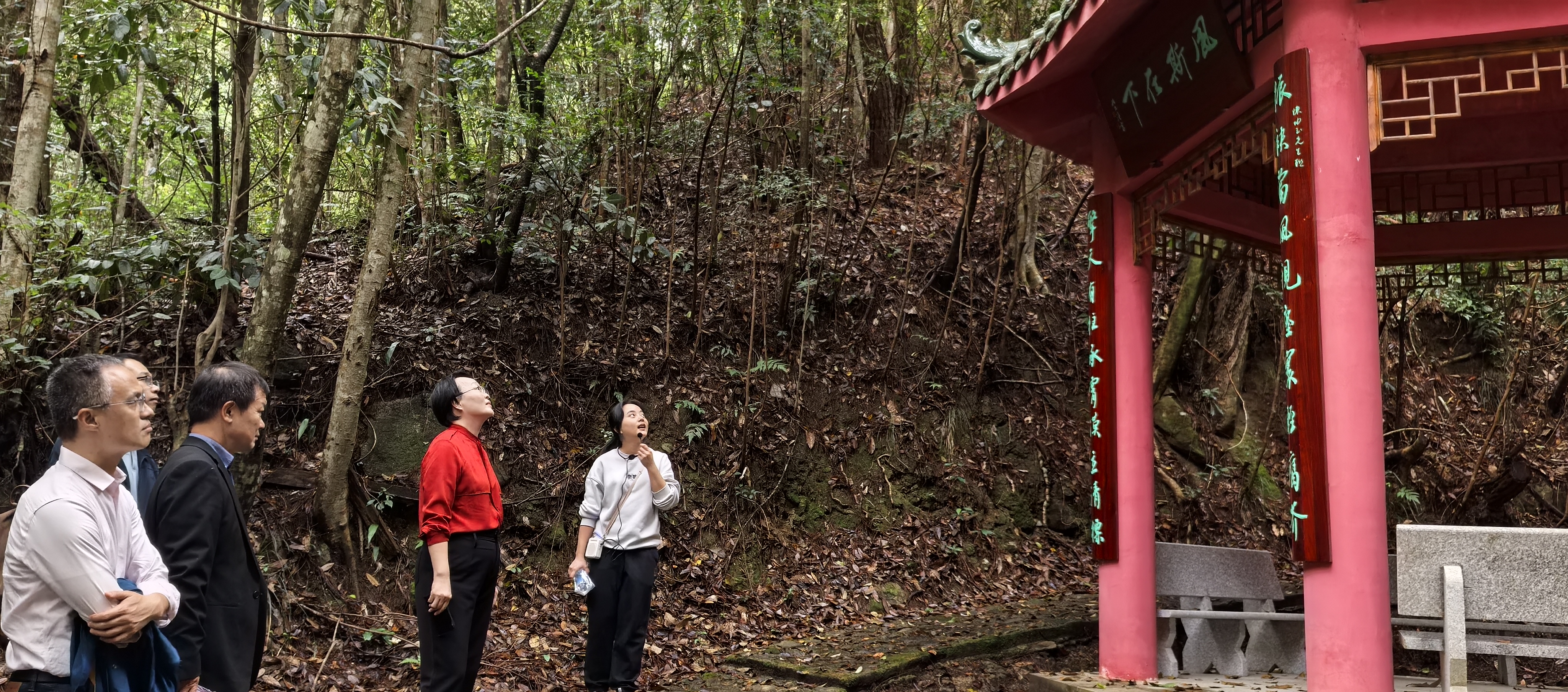 在基地讲解员的引导下,党员们依次参观各功能区域与源头石碑,重点驻足“仰止亭”“喝醒亭”“风斯在下亭”等“三亭三椅”教学点,认真聆听廉洁法规讲解、典型案例剖析与先进事迹分享,深刻感悟“廉洁”蕴含的文化内涵与精神力量。在“仰止亭”,主持人娓娓阐释“仰止”二字背后的廉洁深意,党员们在亭间驻足,水声与廉语相和,宛如一场初心的回望与精神的涤荡。移步至“喝醒亭”,山风穿亭而过,“喝醒”二字如点睛之笔,叩击心灵,发人深省。步入“风斯在下亭”,清风拂面,廉意润心,廉洁理念如春风化雨,悄然浸润心田,滋养正气清风。