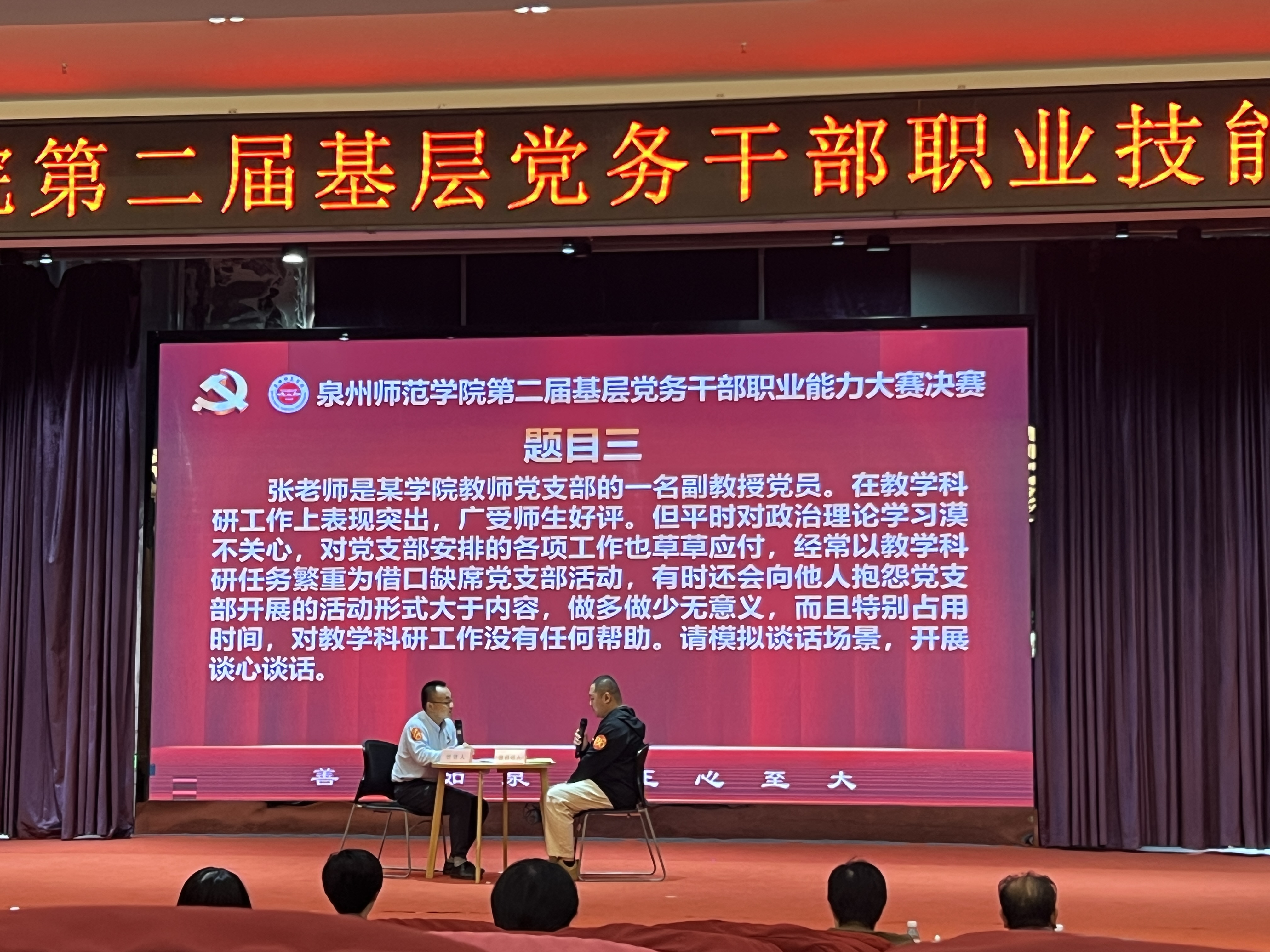 谈心谈话环节,赖鸿作为谈话人,坚守原则、情理并重,有效开展思想引导;黄祖榜作为谈话对象,准确把握思想动态,展现出良好的党性修养与综合素质。两人生动诠释了谈心谈话这一“传家宝”在思想政治工作中的重要作用,赢得现场阵阵掌声。