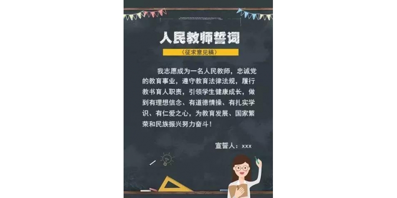 新华网北京9月19日电据教育部网站消息,为增强广大教师的职业荣誉感、历史使命感和社会责任感,根据中央有关精神和各地实践探索,教育部在开展专题调 查研究、广泛听取建议、反复斟酌修改的基础上,制订了《人民教师誓词(征求意见稿)》,现面向社会公开征求意见,意见反馈截止时间为2016年9月26 日。