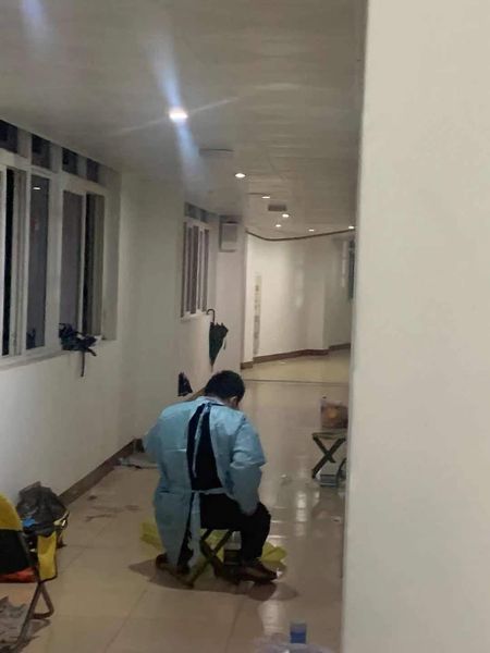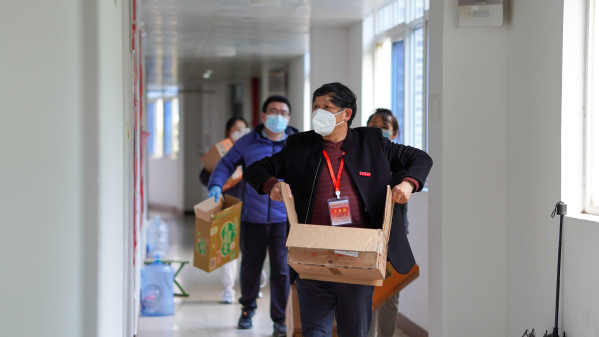 由于长时间的封控管理,许多同学在群聊中说想看看外面的学校。黄腾蛟老师利用休息的时间打开手机直播,带同学们线上了解文传教学楼中物资的摆放情况。视频中,消毒水、口罩、方便面整整齐齐地摆放在一起。充足的物资保障,让足不出舍的同学们心里更加踏实。3月17日,由于长时间运送物资,黄腾蛟老师一遍遍爬楼,一遍遍下楼,已然体力不支。他支起小板凳,给同学数着试剂,然后艰难地移动到下一个寝室门口。这一幕被同学悄悄拍下,照片里佝偻的背影,让同学们不禁泪目。隔着一堵门,老师在这头,我们在这头。