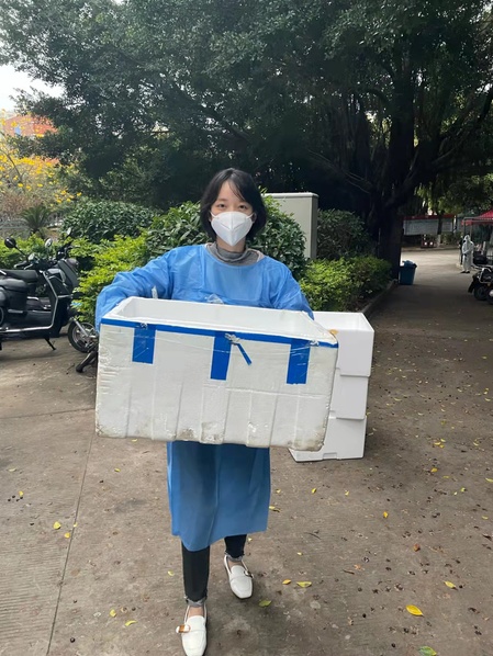 抗疫期间,海洋与食品学院学工办负责人兼辅导员王哲芳老师毅然选择加入教师志愿者团队。她负责为C区17栋宿舍楼的同学们分发物资,买急需的药品、核对并报送学生的核酸数据等。