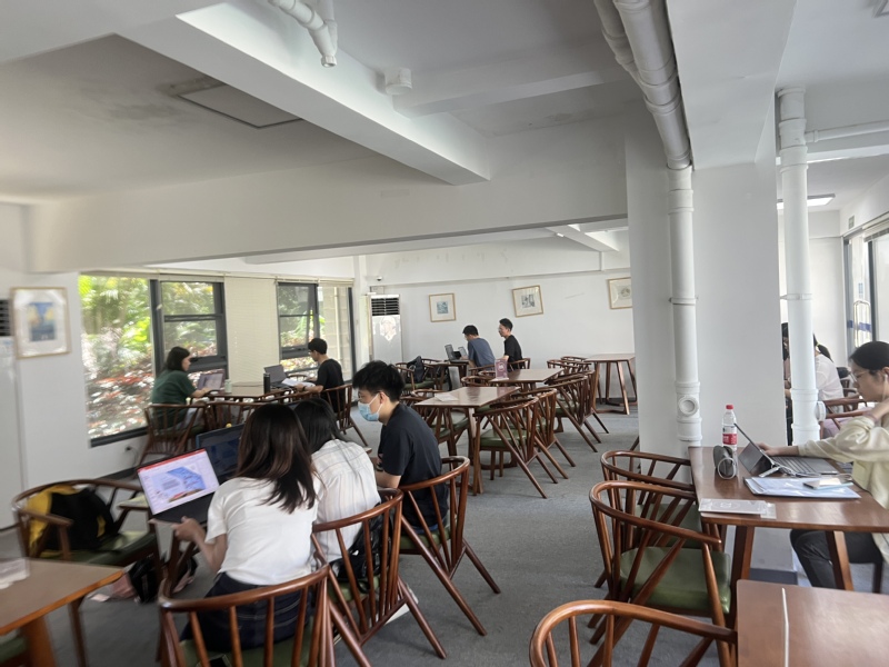 从海韵9学习共享空间出来后英国威廉希尔公司官网一行10人来到海韵14学习共享空间,志愿者介绍了“阅读大学•大学悦读”图书角、海韵14洽谈室老辅导员书架、“一站式”学生社区数据可视化大屏及学生助管团队运行机制。