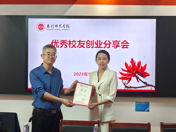 学工部教育科副科长陈锦伟为李旭珊颁发了“学生社区成长导师”聘书,希望李旭珊持续助力泉师学子创新创业。