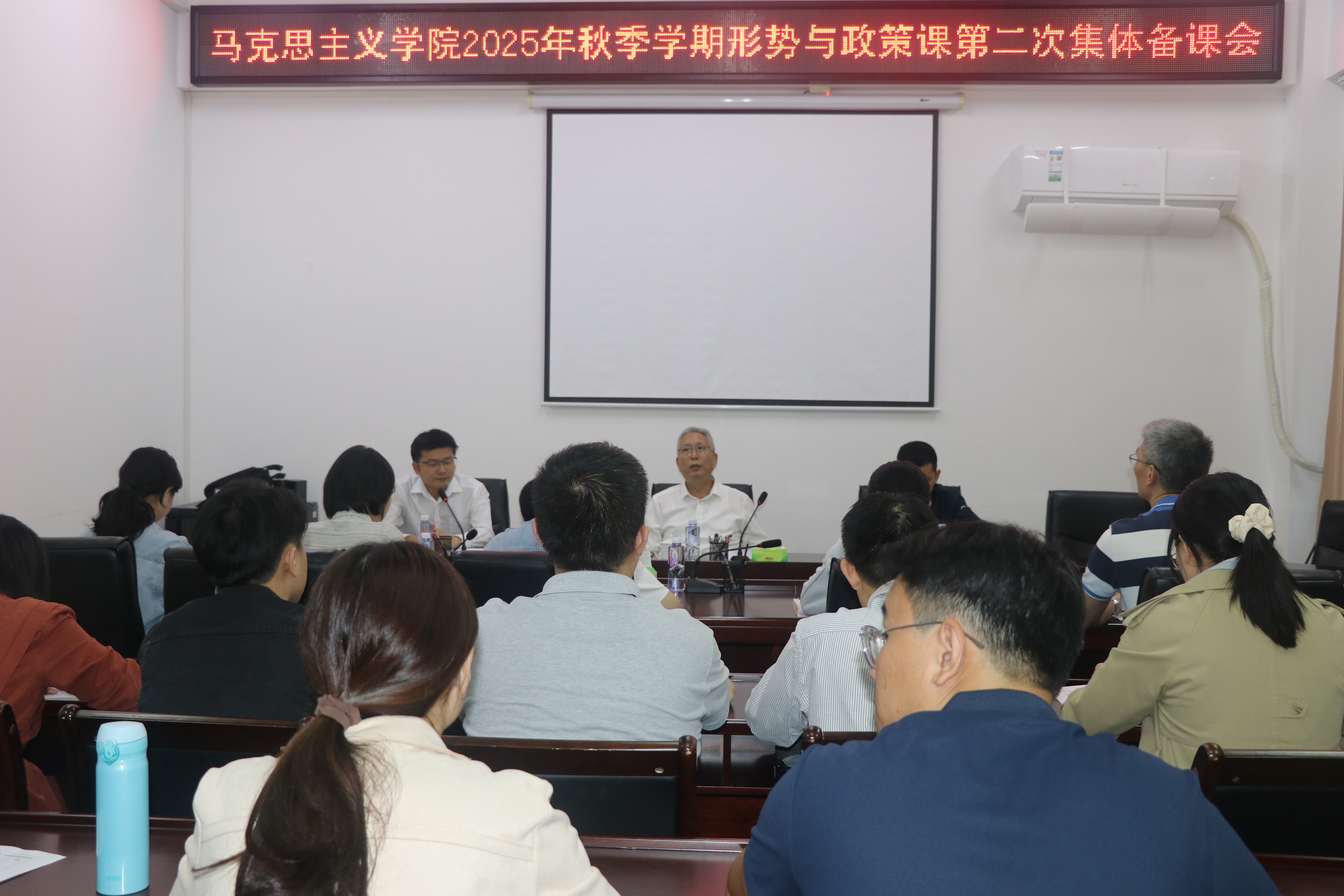 1023日,2025年秋季学期《形势与政策》课第二次集体备课会召开,讨论专题教学设计校党委副书记陈晓风、马院负责人与全体授课教师参加。