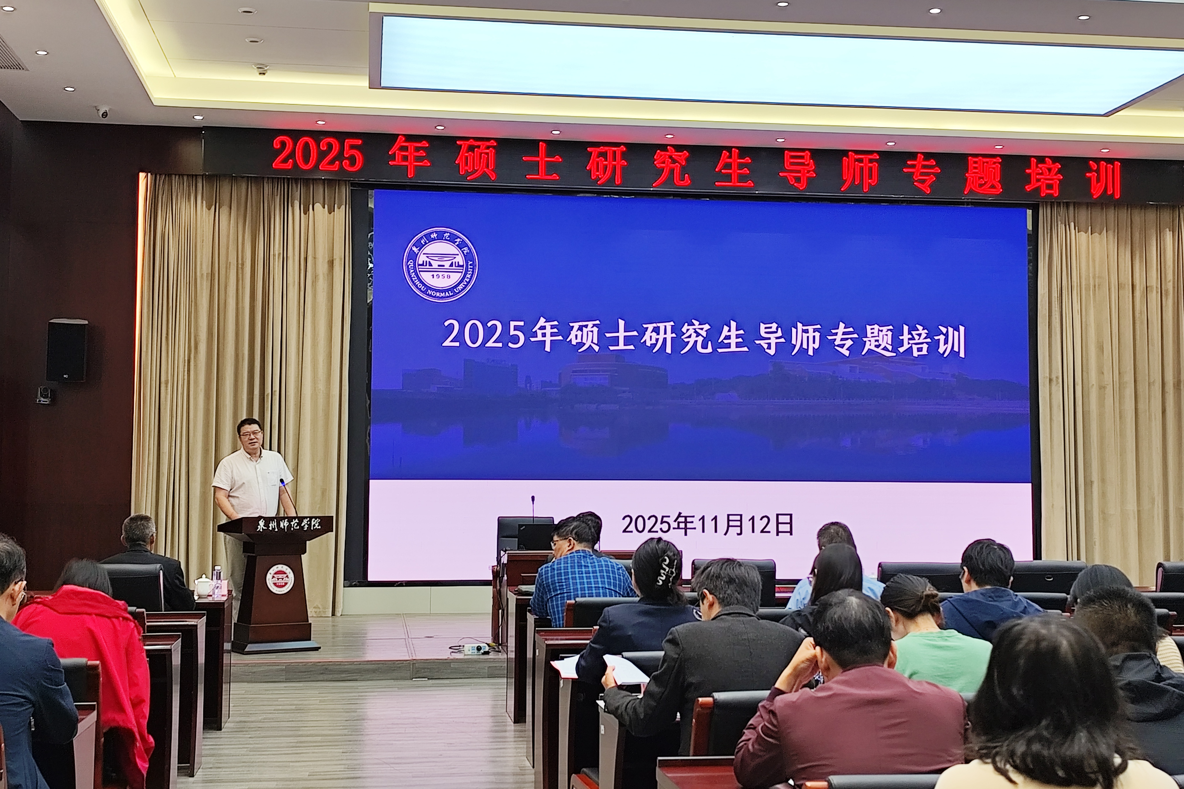 11月12日,学校在中山纪念堂第一会议室举办2025 年研究生导师培训会开班仪式。副校长夏侯建兵出席并致辞,全体研究生导师、相关二级学院分管院长、研究生秘书及研究生处全体人员参加。