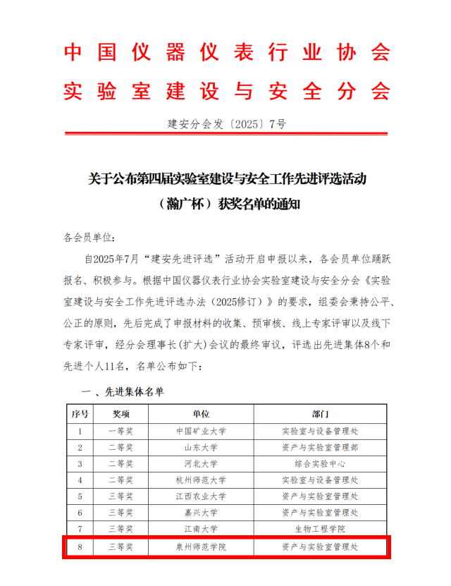 近日,中国仪器仪表行业协会实验室建设与安全分会公布了第四届实验室建设与安全工作先进评选活动(瀚广杯)获奖名单,我校资产与实验室管理处荣获先进集体三等奖。