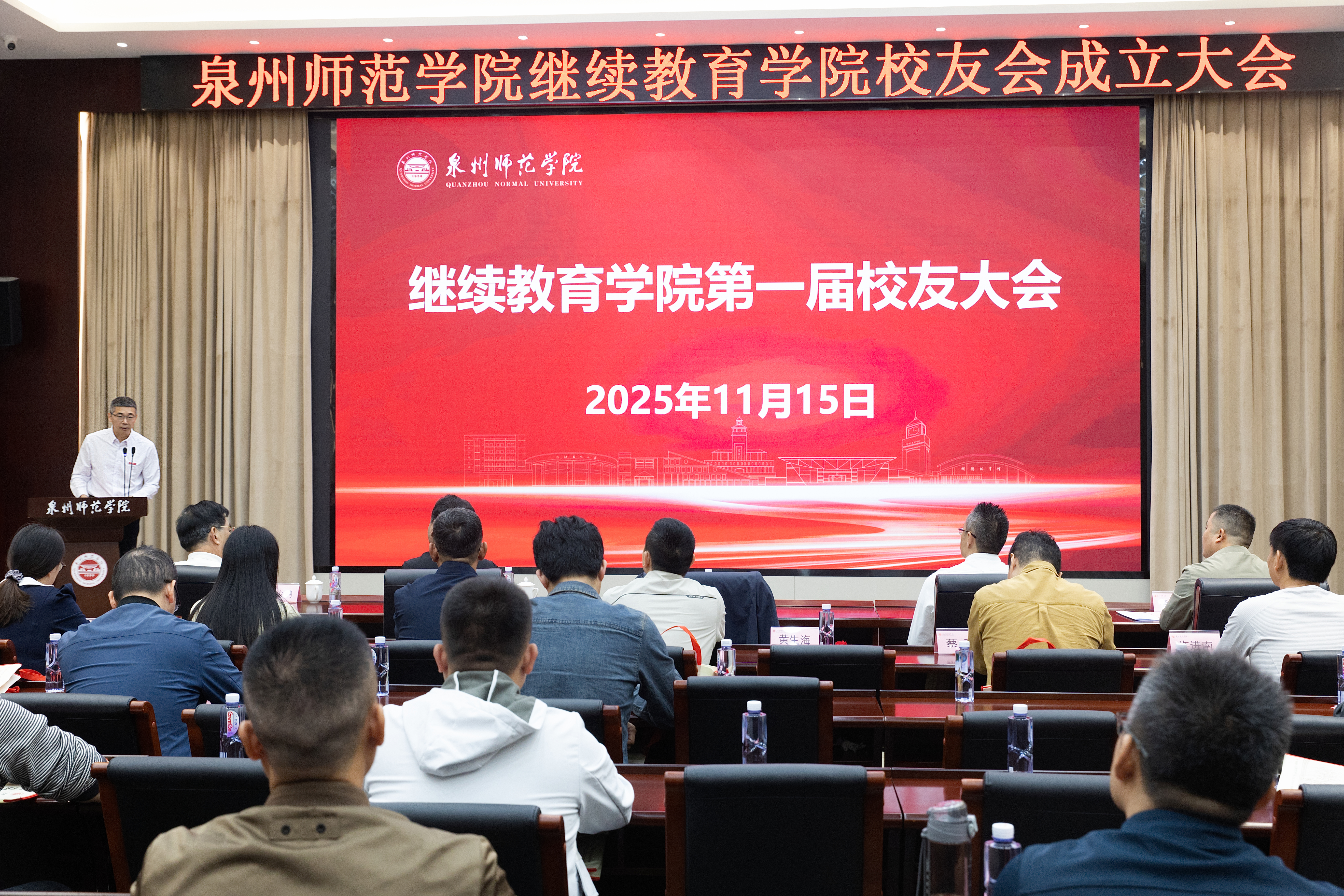 黄江昆代表学校向继续教育学院校友会的成立表示热烈祝贺,并向返校参会的各位校友致以诚挚问候和衷心感谢。他介绍了学校的办学成效和发展规划,并向校友会提出了三点期望:一是更好地凝聚校友力量,增进校友之间、校友与学院及母校之间的深厚情谊;二是更好地服务校友发展,为校友的事业进步、终身学习提供支持和帮助;三是更好地汇聚校友智慧,借助校友的广泛资源和宝贵经验,为学院和母校的高质量发展建言献策、添砖加瓦。他希望广大校友继续关心支持母校建设,共同谱写泉州师院发展新篇章。