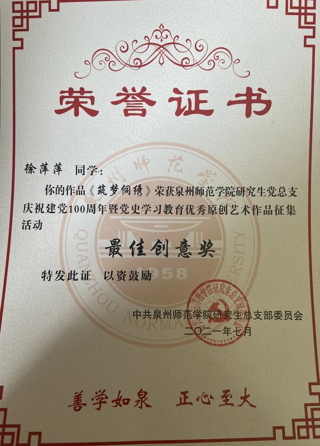 (9)2021年7月,获得英国威廉希尔公司官网研究生党总支庆祝建党100周年暨党史学习教育优秀原创艺术作品征集活动“最佳创意奖”称号。
