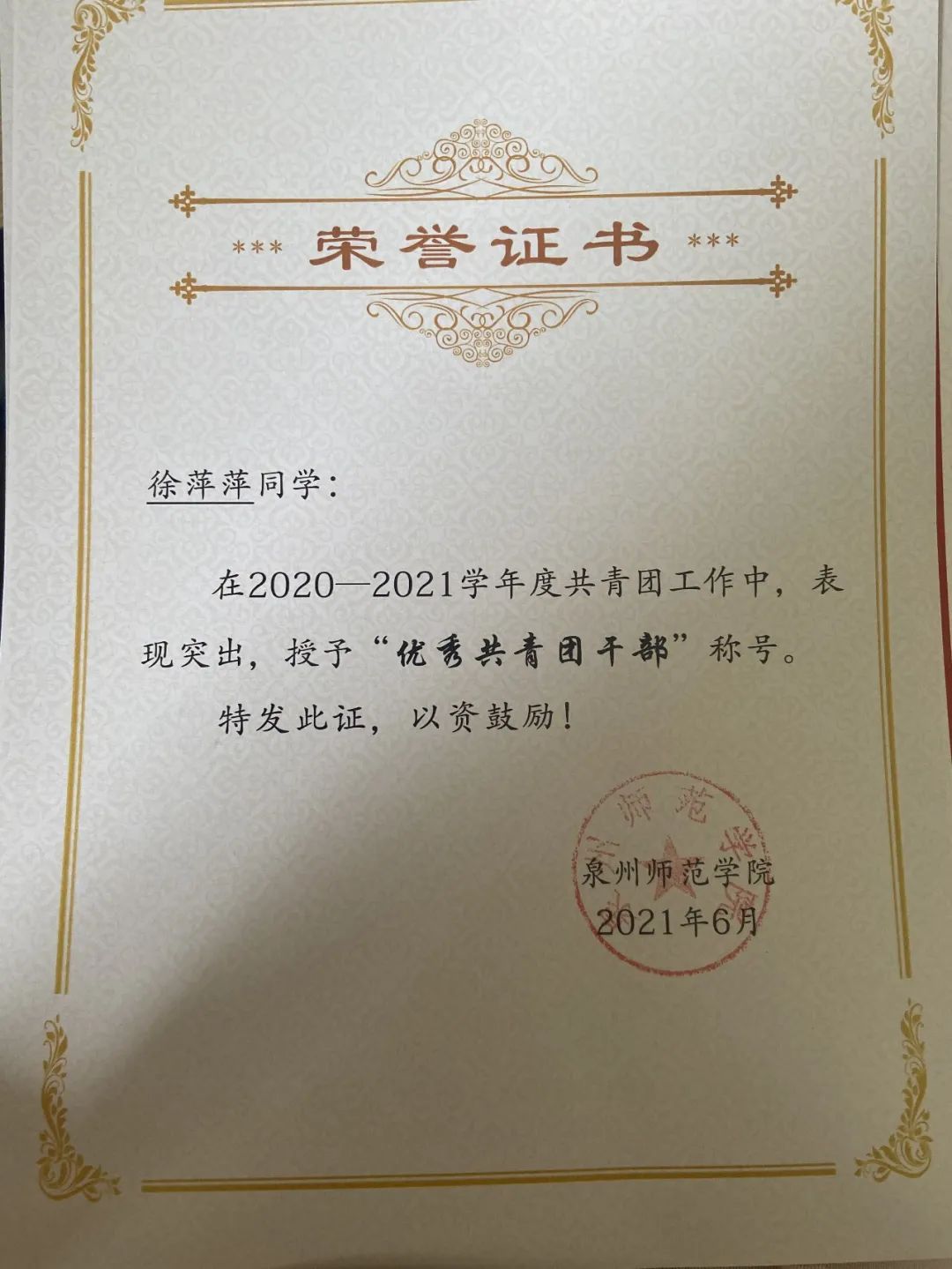 (10)2021年6月,获得英国威廉希尔公司官网“优秀共青团干部”荣誉称号。