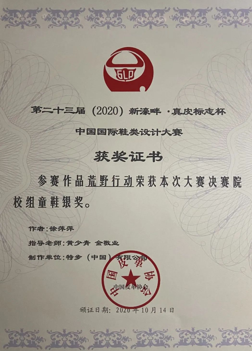 (2)2020年10月,获得第二十三届“新濠畔•真皮标志杯”中国国际鞋类设计大赛银奖。