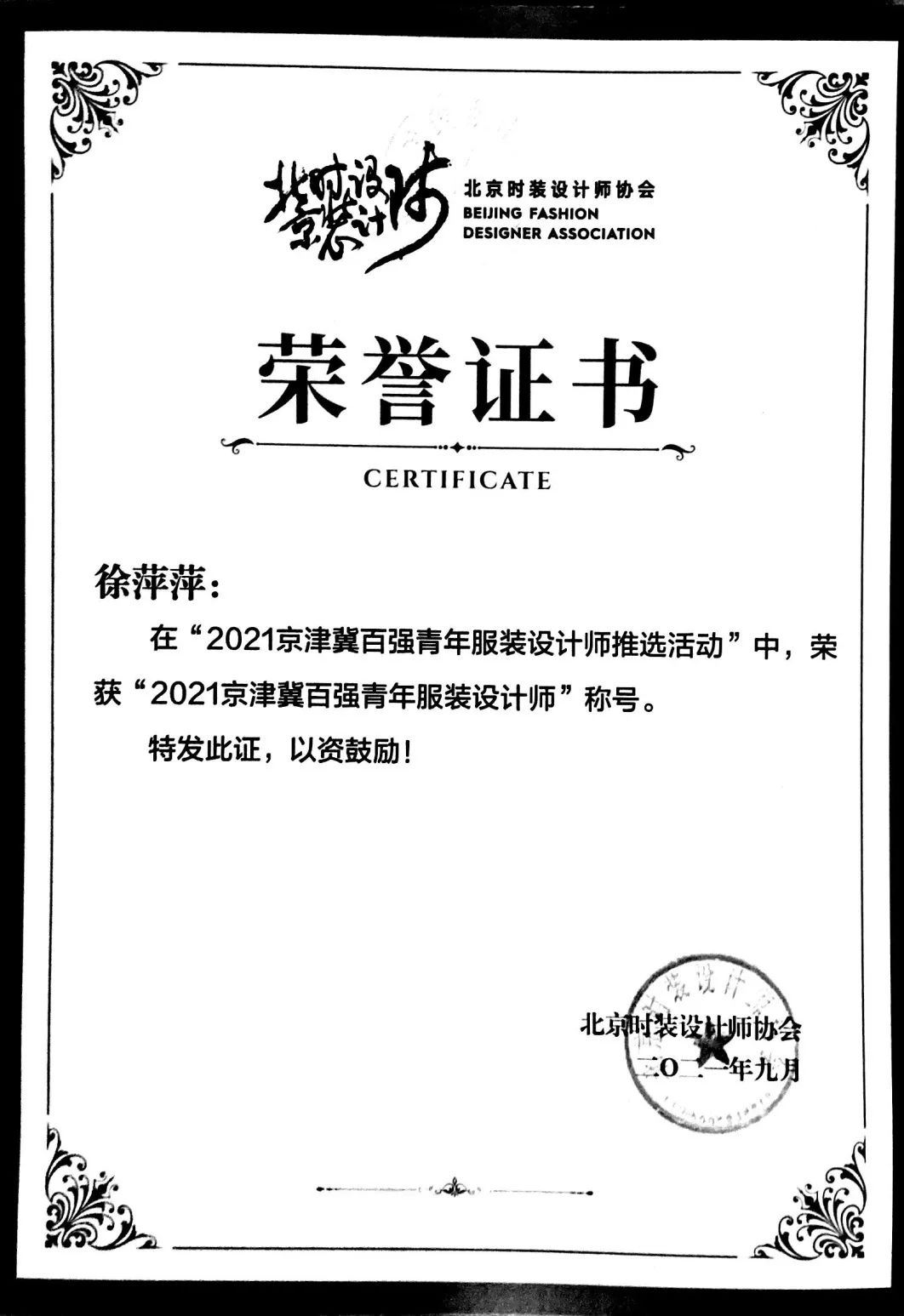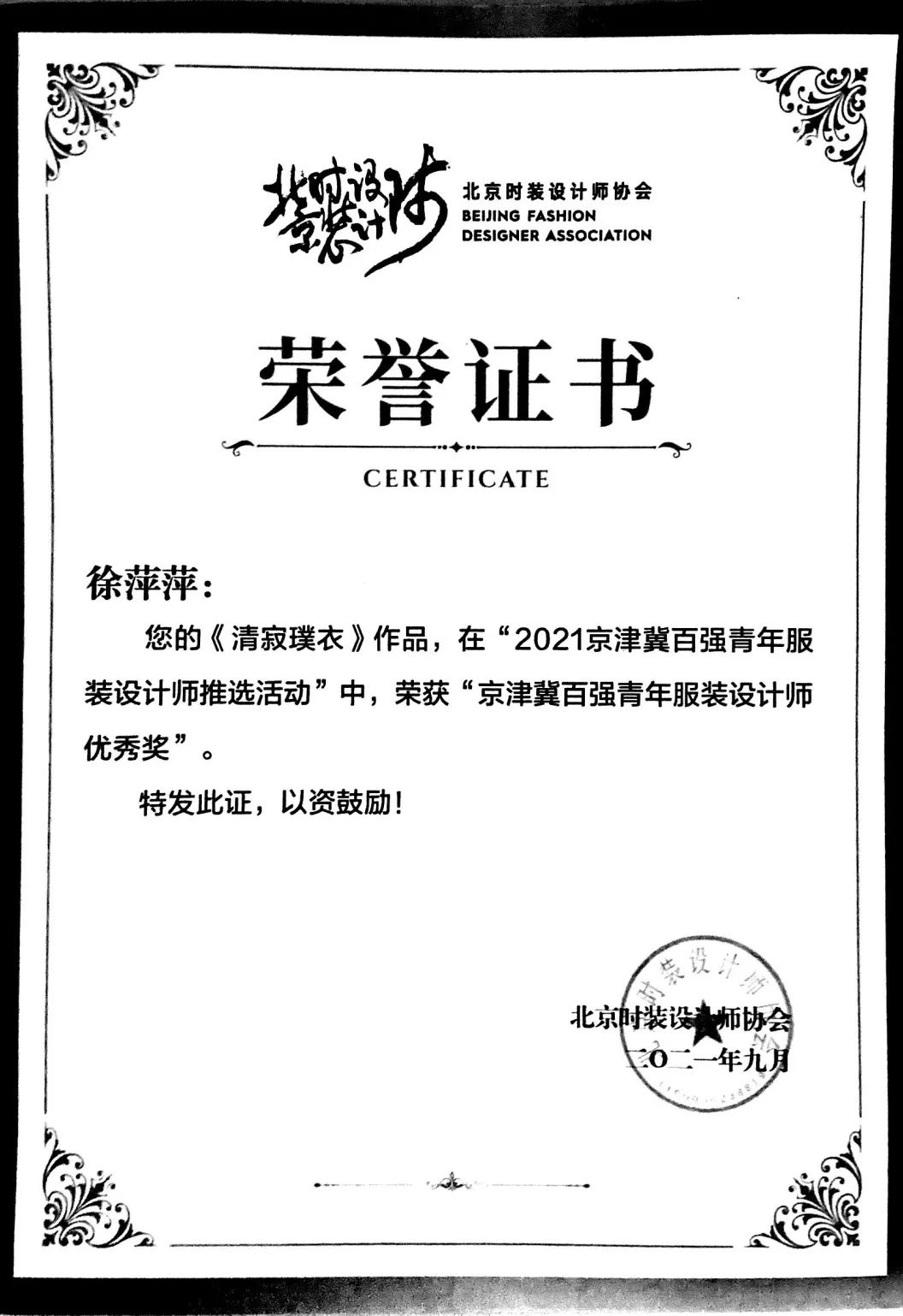 (6)2021年7月,获得“2021京津翼百强青年服装设计师推选活动”优秀奖。