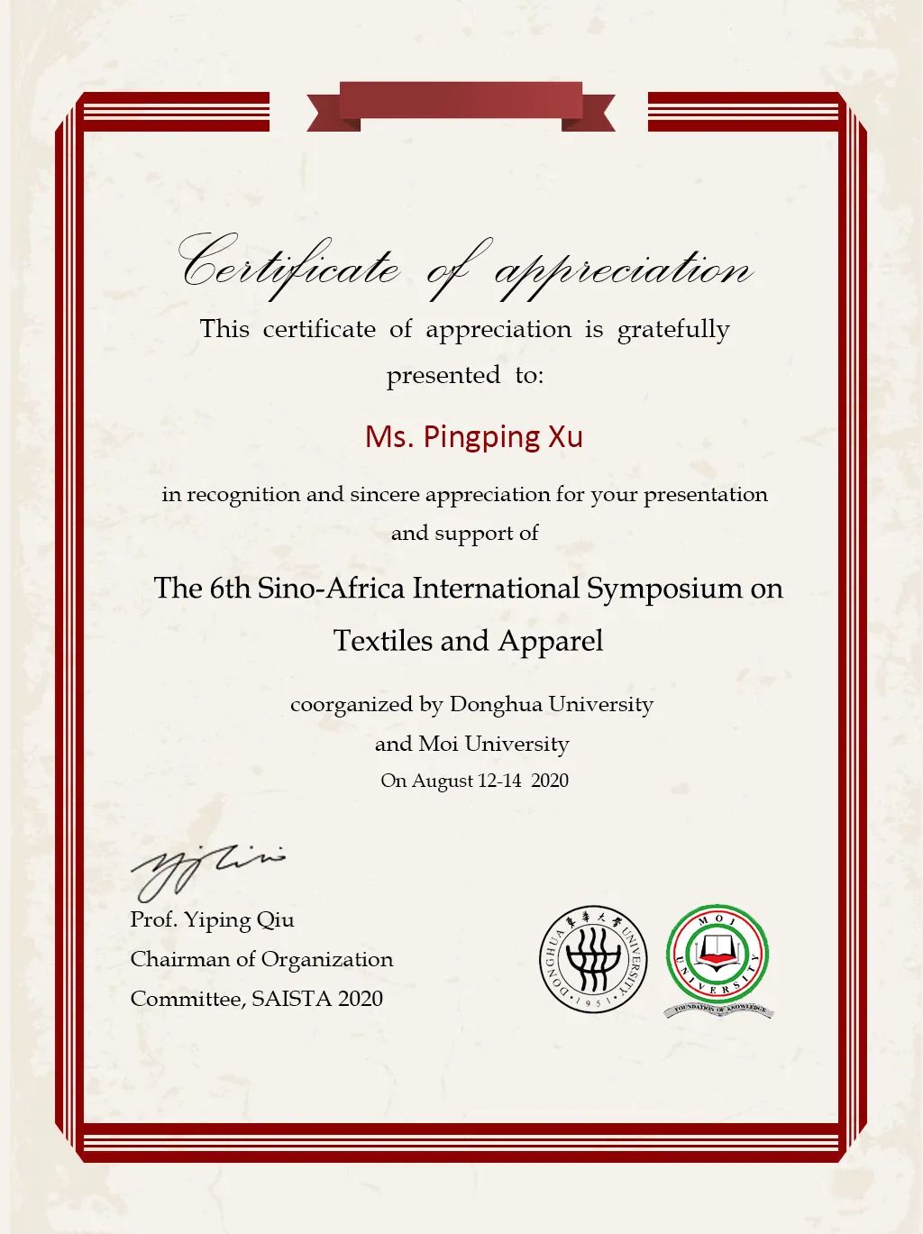 在疫情期间居家学习严于律己,2020年8月12至14日在线上参与了“2020中非纺织服装国际论坛、中非文化交流论坛暨第五届时尚传播国际论坛”并在会议上作出关于“the current state and future development trend of apparel industry under covid-19”的主题英文汇报,推动中非文化交流可持续性发展;可持续发展中的时尚议程;以及后疫情时代下的可持续时尚创新等议题展开了深入研讨。