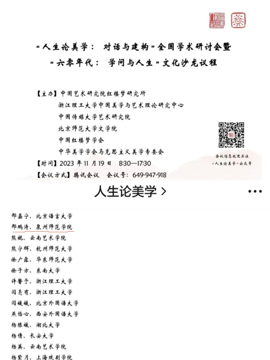 由中国艺术研究院红楼梦研究所、浙江理工大学中国美学与艺术理论研究中心、中国传媒大学艺术研究院、北京师范大学文学院、中国红楼梦学会、中华美学学会马克思主义美学专业委员会联合主办的“人生论美学:对话与建构”全国学术研讨会,于11月19日以“线上线下相结合”的创新方式成功举办。文传学院2023级广播电视领域艺术硕士专业学位研究生邢鹏涛,向大会提交论文《人生论美学话语与乡村文化振兴的双向赋能》,并通过腾讯会议系统在线参加活动。