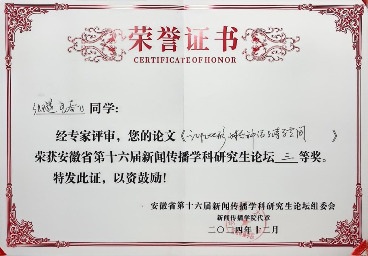 2024年12月21日,由安徽大学新闻传播学院主办的安徽省第十六届新闻传播学科研究生论坛在安徽大学磬苑校区圆满落幕。我院2022级广电研究生张璇在王奋飞教授精心指导下创作的论文《记忆地形、媒介神话与诗学空间:新时代东北影像的命运母题》入围,进行现场的学术报告,并荣获三等奖。