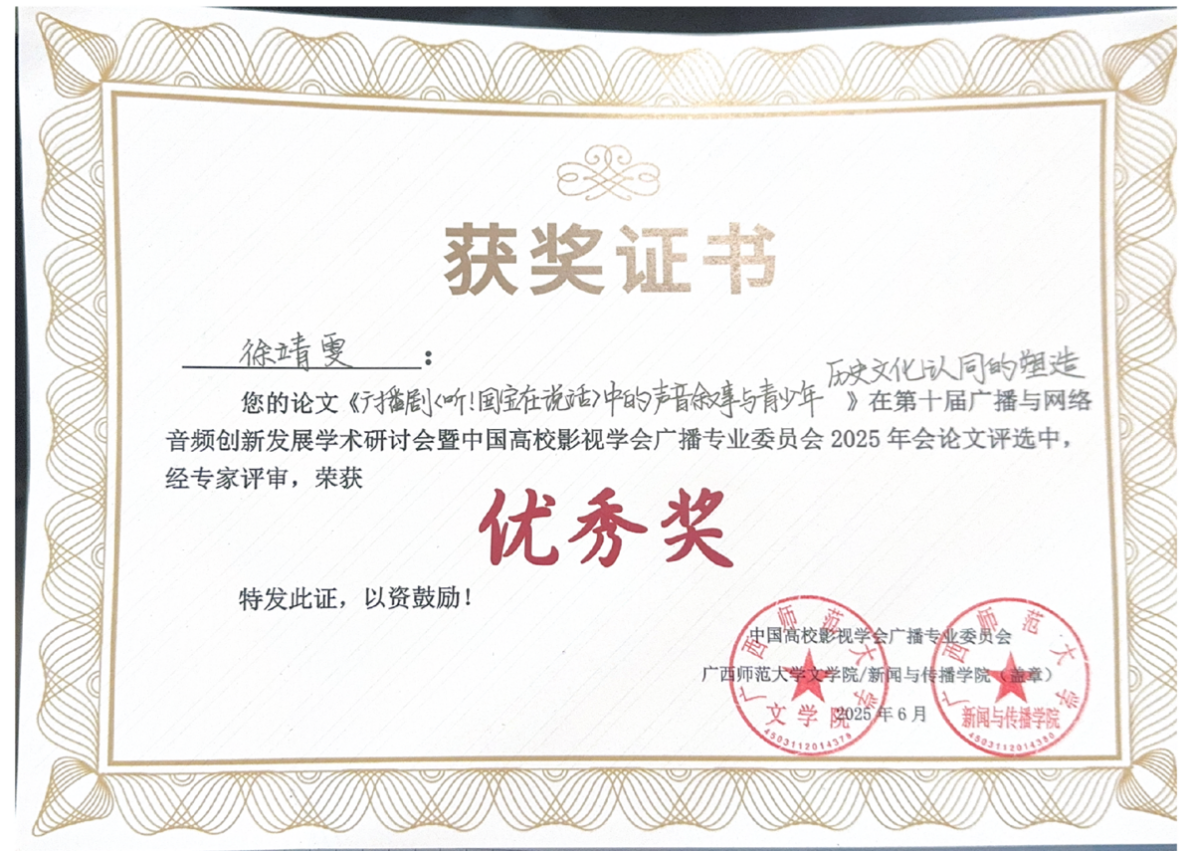 6月20日至22日,中国高校影视学会广播与网络音频专业委员会2025年年会暨第十届广播与网络音频创新发展学术研讨会在广西桂林举行。我院2023级广播电视艺术硕士研究生徐靖雯提交的论文《广播剧〈听!国宝在说话〉的声音叙事与青少年历史文化认同的塑造》入围会议并获得优秀奖。