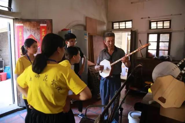 当天最后,南音实践队师生前往参观坝头文化馆,欣赏传承中心老艺人为实践队师生们演奏具有泉港特色的南音《园内》,并实地采访连老先生,今年74岁的连老先生12岁就开始学习南音,其家族自南宋起就有其制作北管乐器之传统,却苦于后继无人,面临失传之窘境,了解到此情况,实践队师生无不为之唏嘘惋惜,并表示将尽力帮助老先生寻找乐器制作工艺继承者;与此同时,实践队学生们还向连老先生了解泉州南音与泉港南音的不同之处,对学术界关于南音与“笙管乐”之关系作初步田野调查,获得珍贵的一手资料。