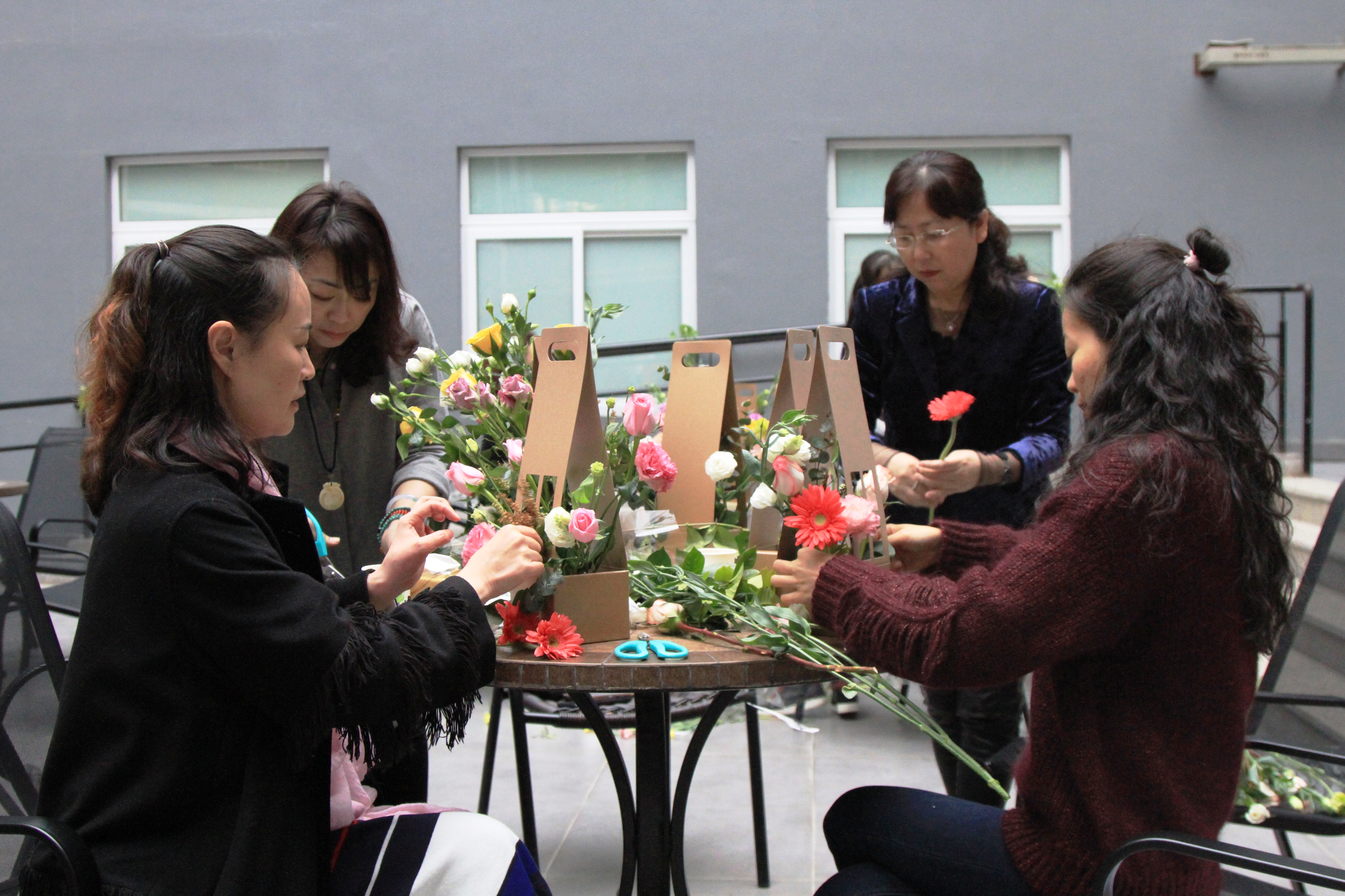 老师们自己动手,把原本普通的花卉通过修剪整理,按照自己的构思把色彩与形状巧妙地搭配起来。看着自己得意的作品,每个人脸上洋溢着幸福的微笑。最后,女教师们带着亲手制作的满意的插花作品合影留念。