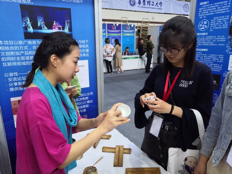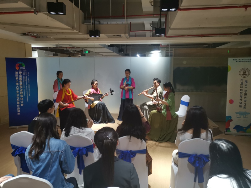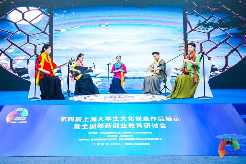 开幕式表演结束后,音乐与舞蹈学院南音系本硕学生在展区进行了南音文创项目展示。项目展示通过现场弹唱南音经典作品、播放南音新作《凤求凰》宣传片、展示南音文创产品、与观展师生互动南音四管的演奏等多种形式来推广南音文化。南音文化推广方向研究生郭鸿梅向观展的上海市教育科学研究院院长、市教委高教处处长桑标,上海财经大学书记许涛,上海财经大学副校长刘兰娟,上海财经大学创业学院执行副院长刘志阳,零点有数董事长、飞马旅联合创始人袁岳等嘉宾介推介原创的南音文创品,如融合了南音和铁观音的创意茶包获得了观展嘉宾的青睐。其他参展师生对我院的南音文创项目充满了兴趣,纷纷前来询问、了解南音文化。在观展的过程中,不少师生通过现场学习双铃、四宝、小叫、响盏等下四管乐器,对南音文化有了初步的认识并表示将持续关注南音。