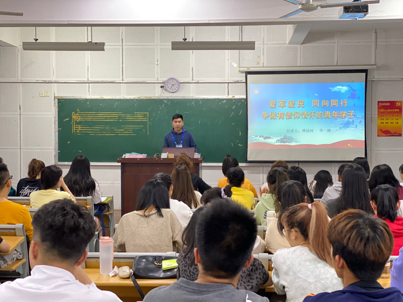 在艺术楼E102教室,傅清河作了《爱国爱军 同向同行 争作有信仰情怀的青年学子》的主题报告,他向同学们分享了自己从军以来的军旅生活,从他的口中,深刻体会到中国军人的艰苦奋斗和无私奉献。傅老师语气平淡,却让同学们意识到和平环境背后,中国军人的负重前行。他分析了当前国际形势,让同学们感受到国防的重要性与紧迫性,他强调,青年在当前国防事业中发挥着重要作用,大学生在新时代发展中有着义不容辞的责任,要不忘初心,矢志强国,做一个有灵魂的人;要珍惜时光,勤学笃行,做一个有本事的人;要脚踏实地,不懈奋斗,做一个有作为的人;要心系国防,热爱军队,做一个有情怀的人。
