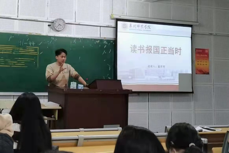 戴华辉以《读书报国正当时》为主题,结合征兵宣传视频,向在场同学分享了个人的军旅生活,并详细地讲解在校大学生入伍的条件和相关政策。其间,戴华辉与学生进行良好的互动问答,进一步让同学们认识到当代青年在国防事业中的重要作用。