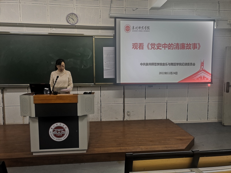 为进一步引导学院师生党员干部不忘初心、牢记使命,严明廉洁纪律,11月24日,音乐与舞蹈学院组织学院全体师生党员、纪检委员、发展对象和入党积极分子在艺术楼E101教室集中观看了廉政教育片《党史中的清廉故事》。学院党委副书记兼纪委书记胡秋娇主持观看。