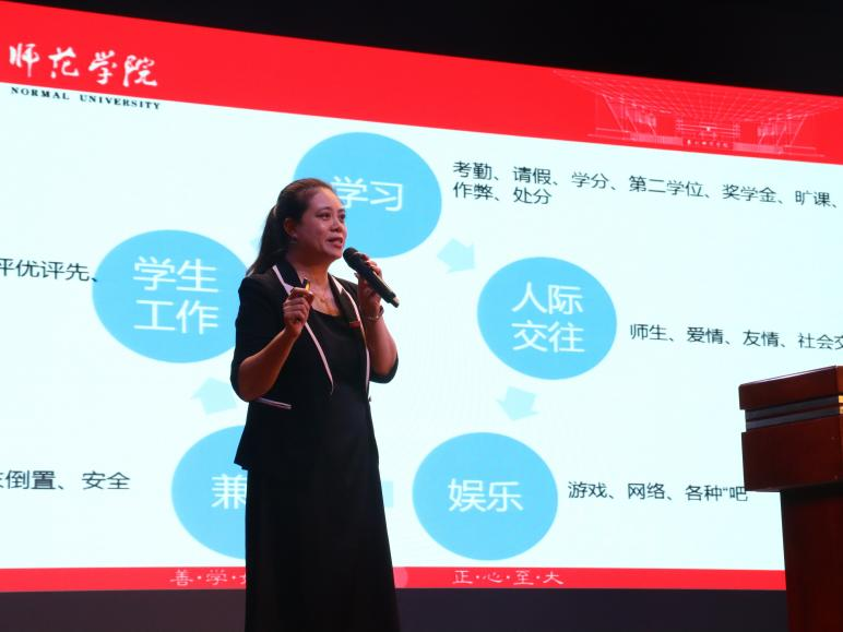 刘晓莹向新生介绍了院学工办的各项工作内容,从学习、人际关系、社会工作、心理调试、大学生职业生涯规划等维度与新生进行了交流与分享。刘晓莹强调“自律即自由”,通过解读《学生手册》中的校规校纪,亮明大学中的各类“高压线”,勉励新生要明确目标、严于律己、集中精力学习,把握每次机会、强化专业能力、积累实践经验,着力提升自身的综合素质,争做一名有理想、敢担当、能吃苦、肯奋斗的新时代好青年。