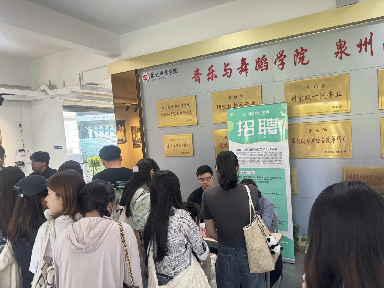 本次招聘会共有丰泽区言舞艺术策划活动中心舞线谱文化传播有限公司泉州厝边欢喜文化传媒有限公司泉州乐琦文化传播有限公司厦门市同安区尚音艺术培训学校5家用人单位参与招聘会现场人头攒动,气氛热烈,各招聘单位从企业文化、发展成果、未来发展、人才招聘需求及招聘程序几个方面进行专题宣讲,并集中回答了同学们对薪资待遇、住宿条件、工作地点安排等一系列问题,让同学们对用人单位详情有了更深的了解。毕业生携带求职简历,积极与用人单位交流沟通,结合自身能力和需求投递求职简历。部分用人单位现场开展面试和签约工作。学院领导、毕业班辅导员深入招聘会现场,了解毕业生的求职意向和应聘情况,倾听用人单位对我院人才培养的意见建议,并向用人单位热情推荐我院毕业生。