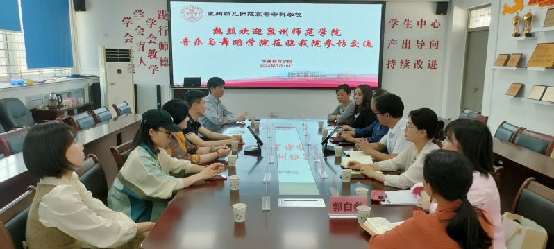 为深化校校合作,促进毕业生高质量就业,5月16日下午,学院副院长翁世晖带队赴泉州幼儿师范高等专科学校学前教育学院开展访企拓岗。办公室、艺术实践中心负责人,舞蹈学专业副主任、教学秘书和专任教师参加活动。
