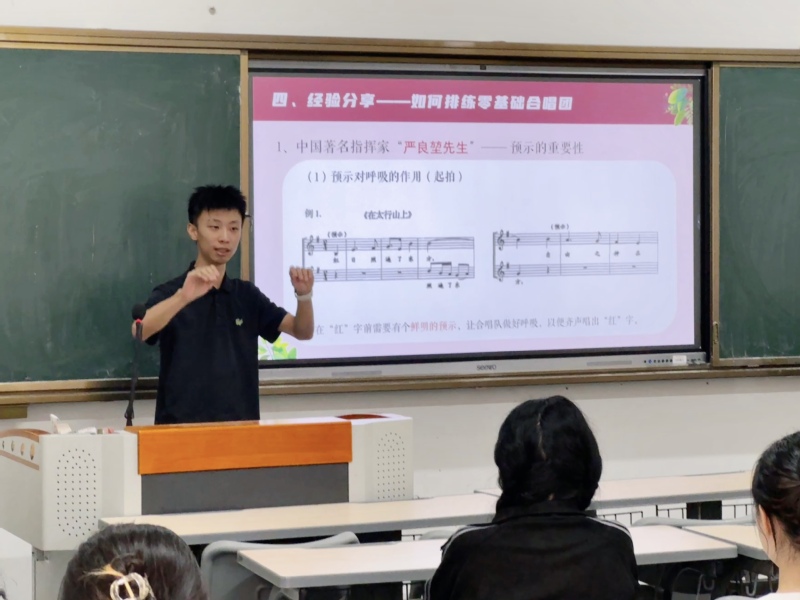 参与全校教职工小组合唱指导实践的研究生通过合唱视频展示,分享了自己合唱指导实践的心得体会。