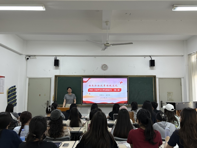 吴亦伦结合《习近平与大学生朋友们》第二卷“习近平总书记勉励我们未来做传播优秀传统文化的好老师”的故事,从传统文化是什么、传统文化的魅力、传统文化的传承等三个方面进行讲解,引导学生用新时代的艺术语言和多元风格传承弘扬中华优秀传统文化。(音乐与舞蹈学院学工办)