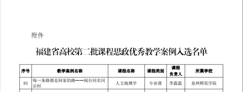 近日公布的福建省第二批课程思政优秀教学案例评选结果,我院李蕊蕊副教授主讲的《人文地理学》案例获批高校课程思政教学优秀案例。