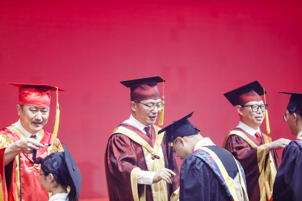毕业典礼在全体合唱《歌唱祖国》中落下帷幕。随后,学校举行学位授予仪式,全体校领导和二级学院负责人为获得硕士学位和学士学位的毕业生一一扶正流苏。