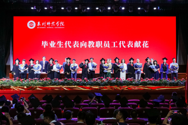 毕业生代表向教师、辅导员、宿管员、保安员、餐厅服务员等一线教职工的代表献花,感谢全体教职员工的辛勤付出。