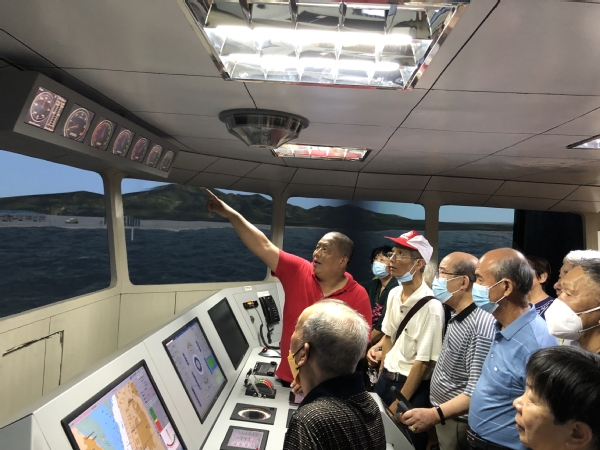 活动现场,老同志们在交通与航海学院讲解员的带领下先后参观了水上训练中心和大型船舶操纵模拟实验室。在水上训练中心,老同志们实地观看了“泉州号”、救生艇等,对海上安全应急、海上求生、水手工艺等基本知识和技能有了初步了解。大型船舶操纵模拟实验室由一条主本船、三条副本船和控制室构成,老同志们触摸着船舶驾驶仪表盘,并在模拟器上体验如何操纵船舶航行,感受了在海上劈波斩浪的新奇。