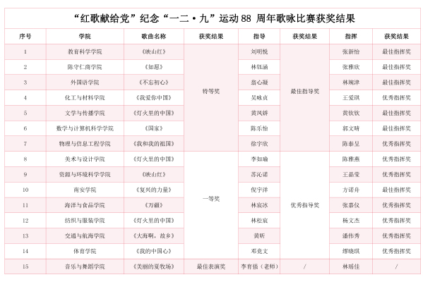 本次比赛设置了特等奖7个、一等奖7个、最佳表演奖1个,最佳指导奖6名、优秀指导奖8名、最佳指挥奖6名、优秀指挥奖8名,并进行现场颁奖。(校团委)