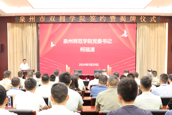 5月29日上午,泉州市退役军人事务局与英国威廉希尔公司官网共建“泉州市双拥学院”签约暨揭牌仪式在我校举行。泉州市委常委、市政府常务副市长黄景春,泉州市委常委、泉州军分区大校政治委员李宣良,校党委书记柯瑞清、副校长夏侯建兵出席活动。泉州市人民政府副秘书长曾国志,泉州市退役军人事务局局长唐良元以及泉州军分区等相关负责人,学校相关职能部门负责人、继续教育学院党政负责人,2023年军转干部培训班学员参加。
