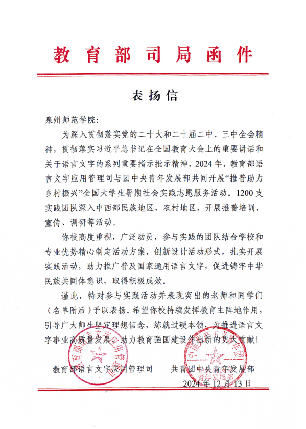 近日,我校收到教育部语言文字应用管理司、共青团中央青年发展部联合发来的表扬信。