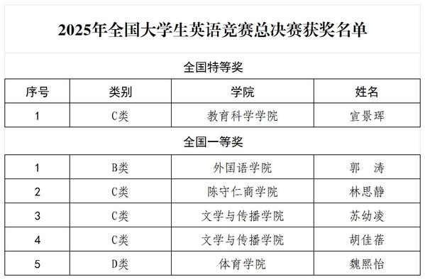 日前,2025年全国大学生英语竞赛总决赛结果揭晓,我校全国特等奖1项,全国一等奖5项。其中,来自教育科学学院的宣景晖同学荣获C类全国特等奖。